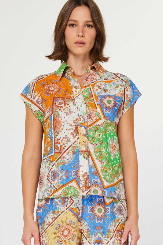 Bandana Cap Sleeve Button Down Blouse