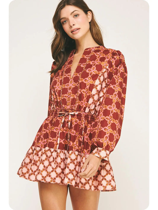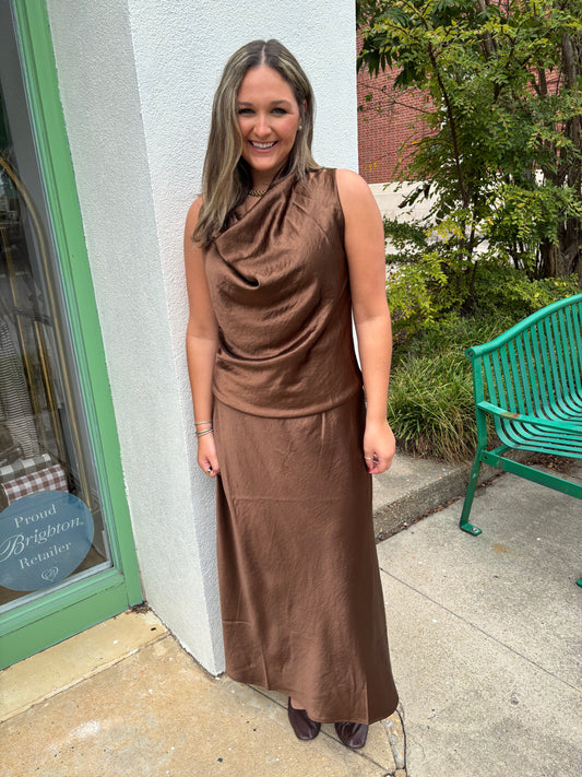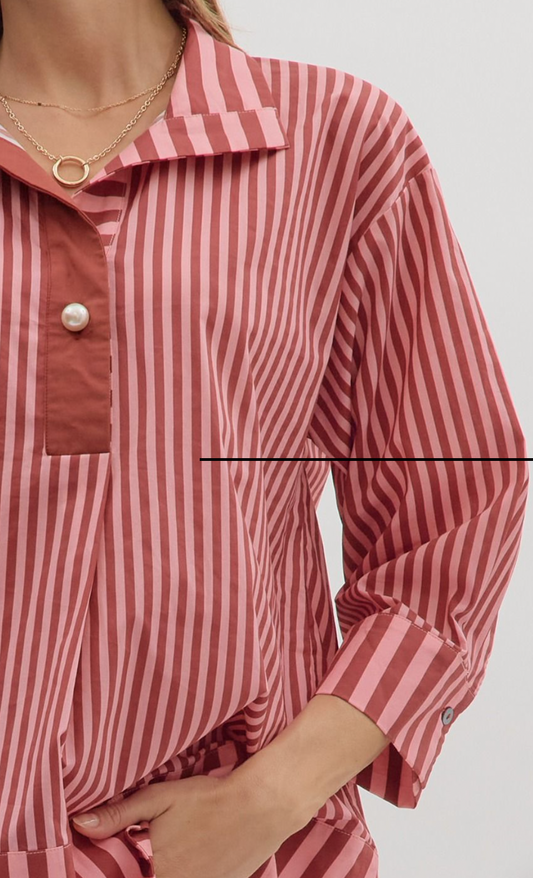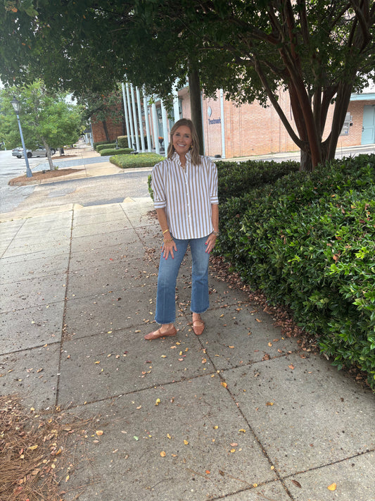 Puff Sleeve Top with Ruffle Collar Brown Stripe