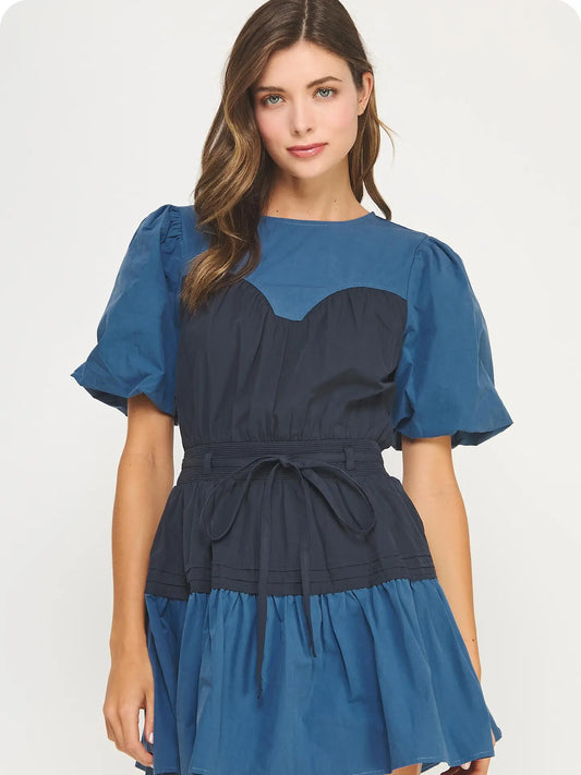 Color Block Pin-Tuck Detail Poplin Mini Dress