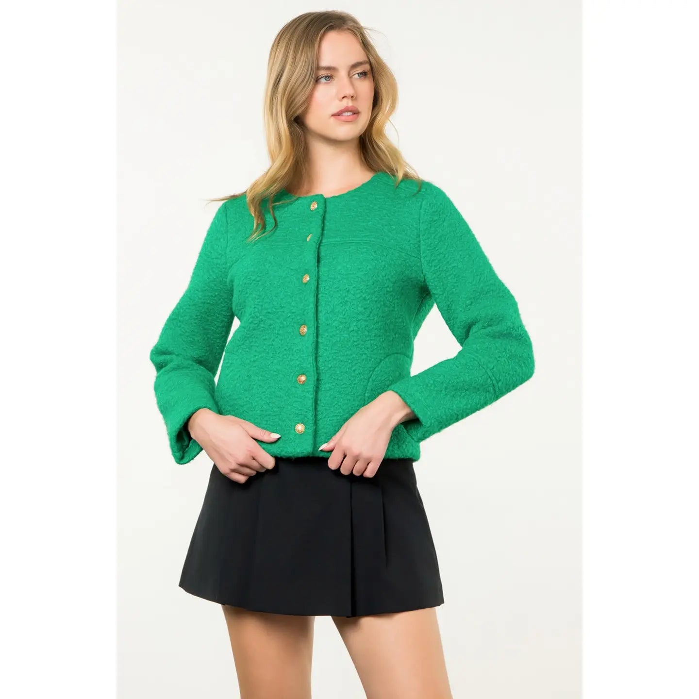 Button Up Boucle Jacket . / Style Measurements for Size S / Designed in USA - Body Length: 22 in - Bust Width: 42 in - Sleeve Length: 24 1/2 in . / Model Sizes - Wearing Size S - Height 5' 9", Bust 32", Waist 25 1/2", Hips 36" . / Prepack Contents - In a Pack of XS(1), S(2), M(2), and L(1) per Color Only . / Fabric Content - WOVEN / 100% Polyester