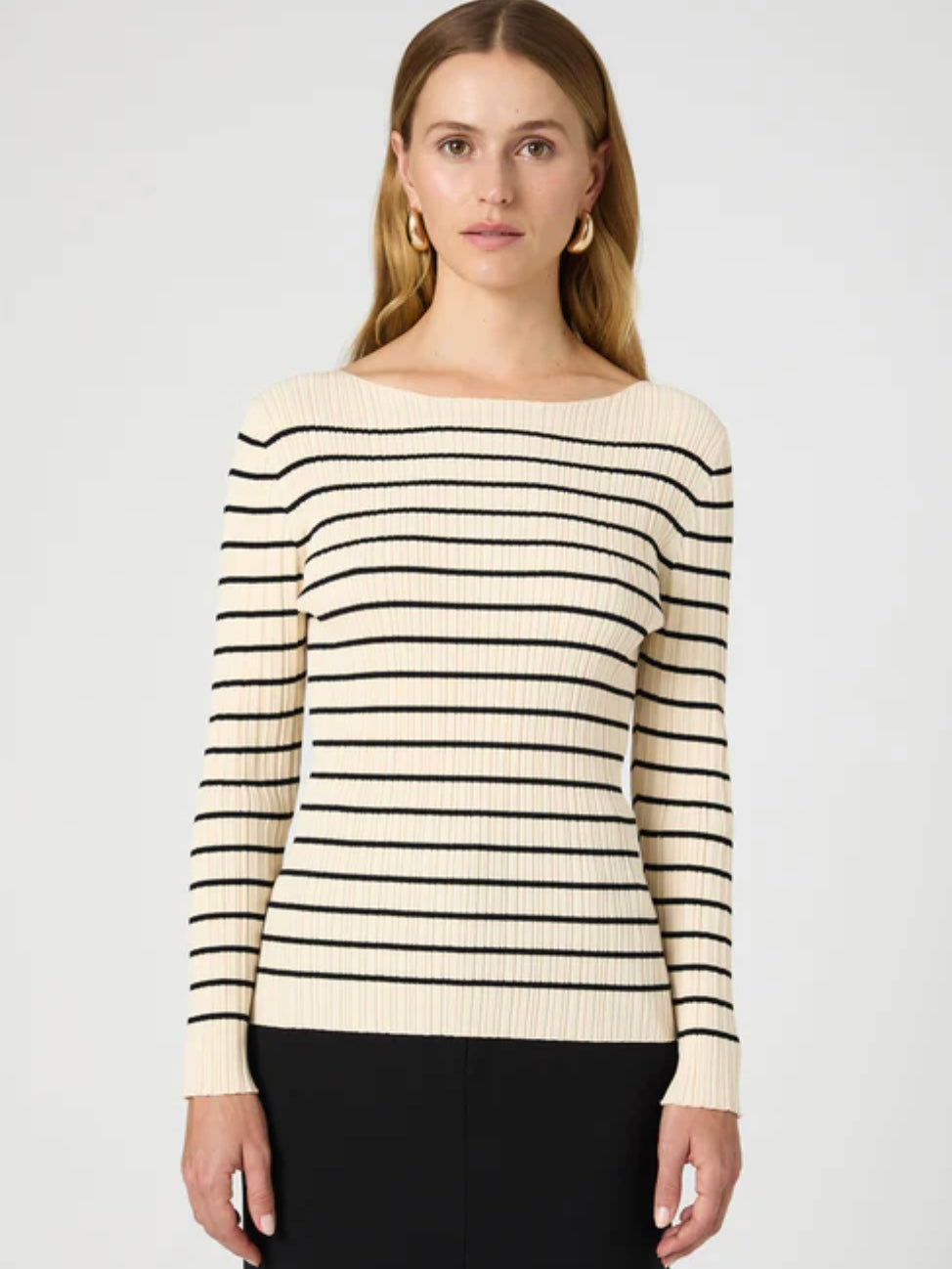 Our Stripe Crinkle Knit has earned its stripes. Comfy meets classic with an irresistibly soft body sporting thin horizontal stripes, fashioned with long sleeves and a boatneck neckline.
