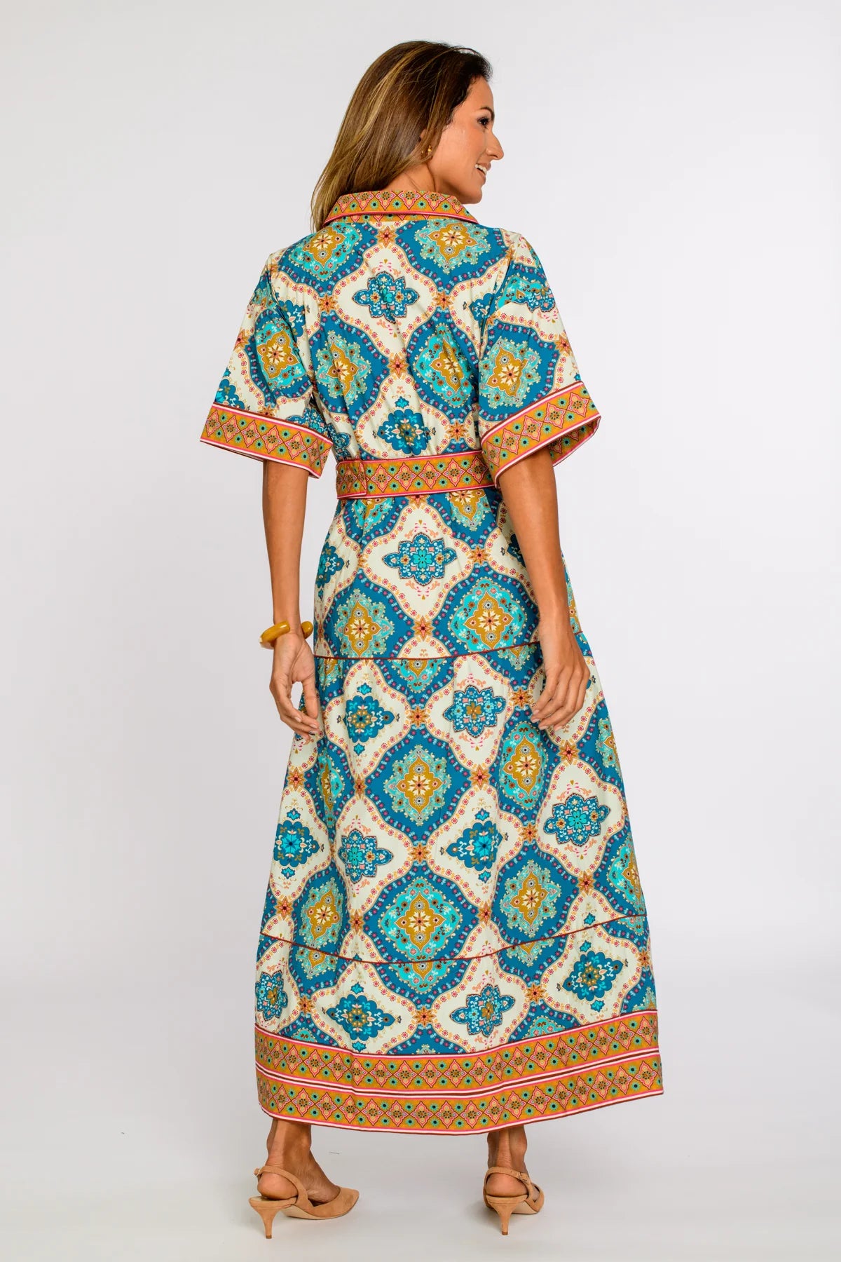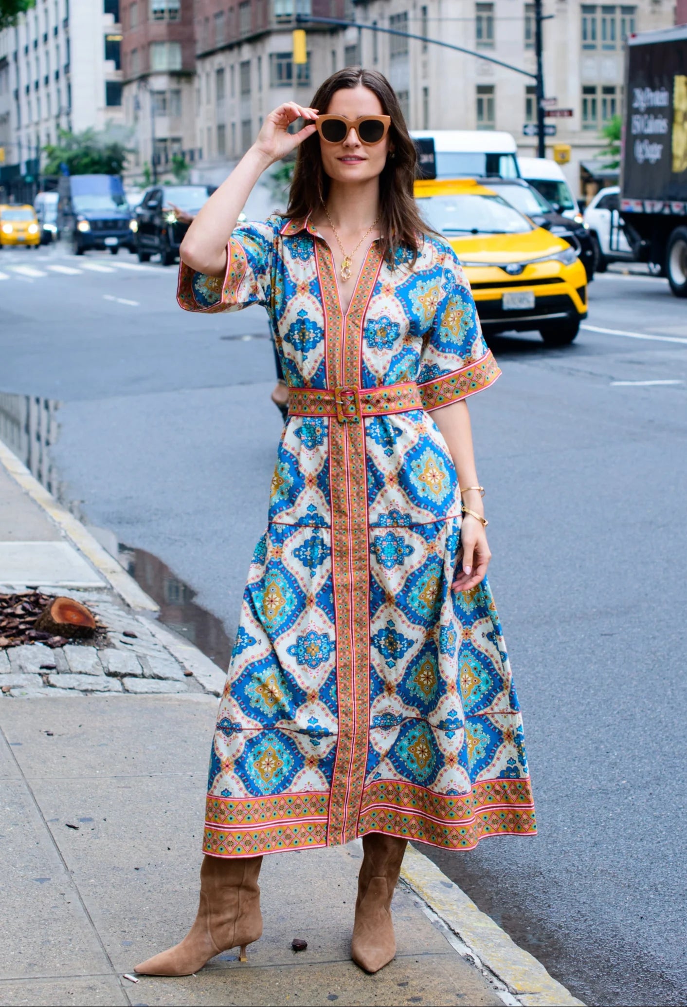 The Collins Dress in Patchwork is a statement piece that combines sophistication with femininity. Her fitted torso is beautifully balanced by dramatic sleeves and a full skirt, finished with decorative trim and piping details.