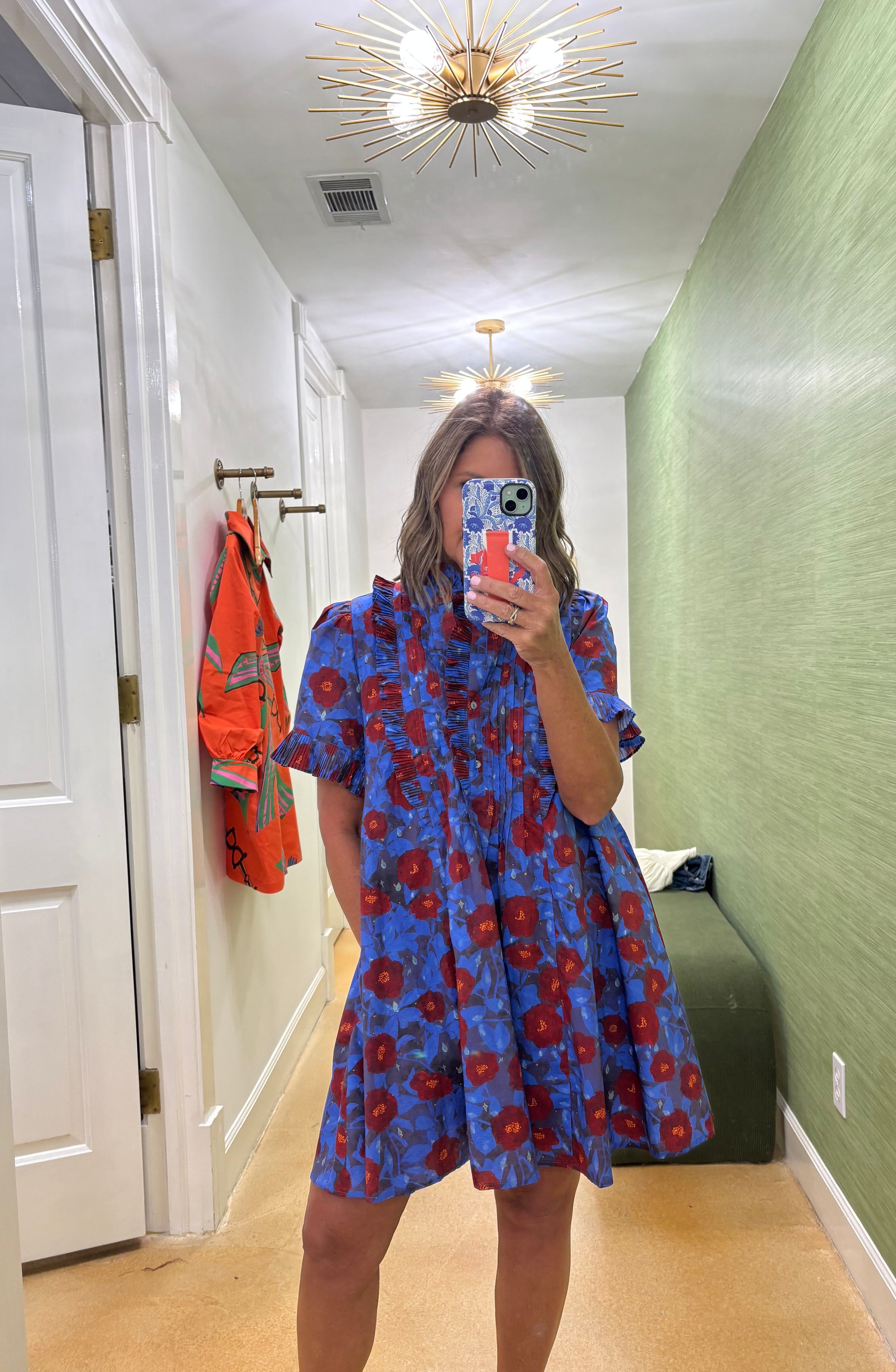 A chic and enchanting short dress designed in a rich midnight hue, adorned with delicate floral patterns that bring a touch of romance to the look. The silhouette is effortlessly feminine, with a flattering fitted bodice that flows into a playful above-the-knee hemline. Lightweight fabric drapes beautifully, making it perfect for both daytime charm and evening elegance. Pair it with strappy heels for a night out or layer it with a light jacket for a more casual yet sophisticated vibe.