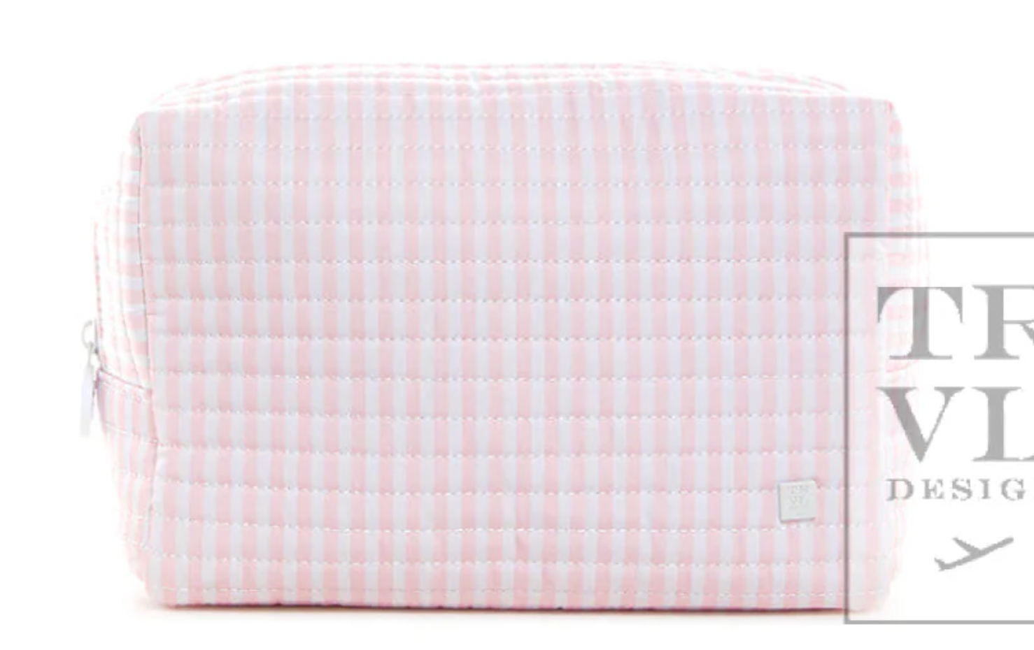 Perfect for Everyday use! This ultimate large, soft, lightweight quilted zippered pouch is ideal for diapers, wipes, toiletries, cosmetics and everything in between. This style is designed to stand on its own and has an interior pocket for smaller needs. Both functional and beautiful, this would be a great addition to any TRVL set and it is wipeable inside and out and machine washable.